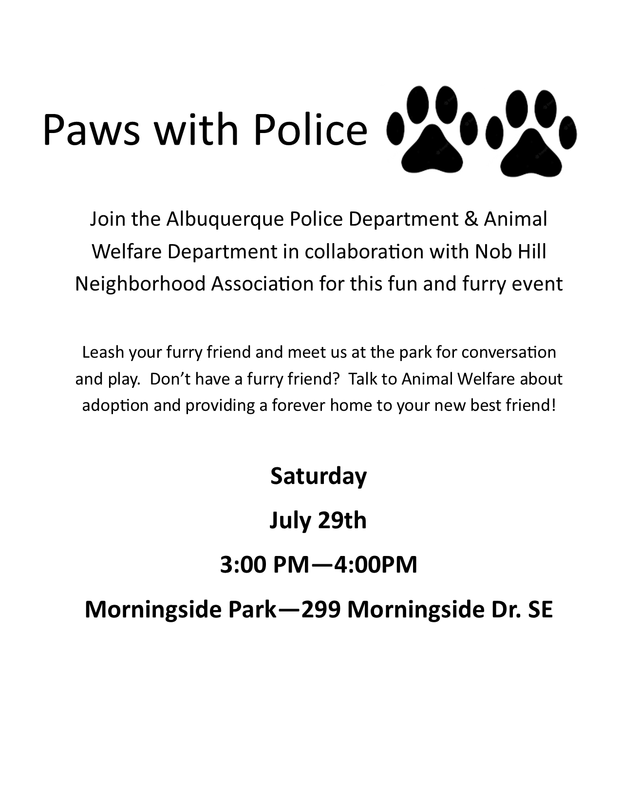 * Saturday, July 29 - 3-4 pm - Paws with Police - bring your pup and meet our officers and Animal Welfare representatives. (See flyer below)