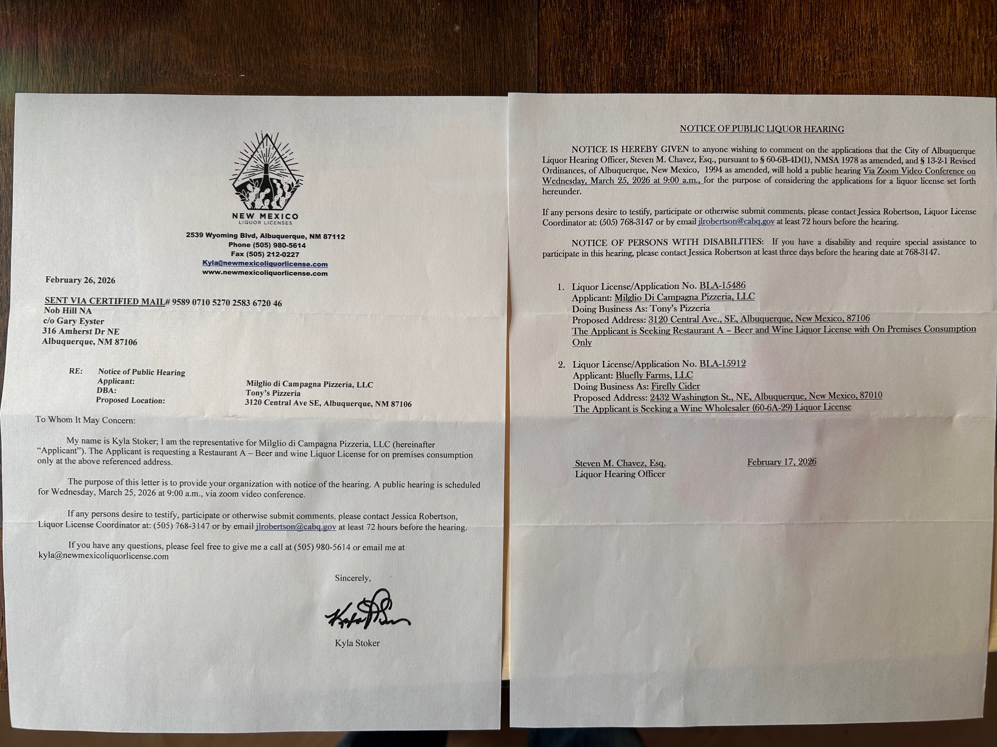 The Liquor Hearing Officer will hear the request via zoom on March 25, 2026 at 9 am. Written comments will be accepted by jlrobertson at cabq.gov until 72 hours before the hearing.