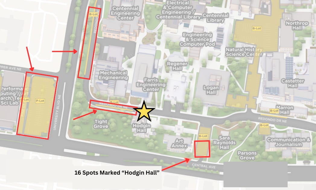 There will be plenty of free parking near Hodgin Hall (marked with a star below). All areas outlined in red will be available for our event. Also, the ART stop at University Blvd. and Central Ave. is a short distance from the hall.