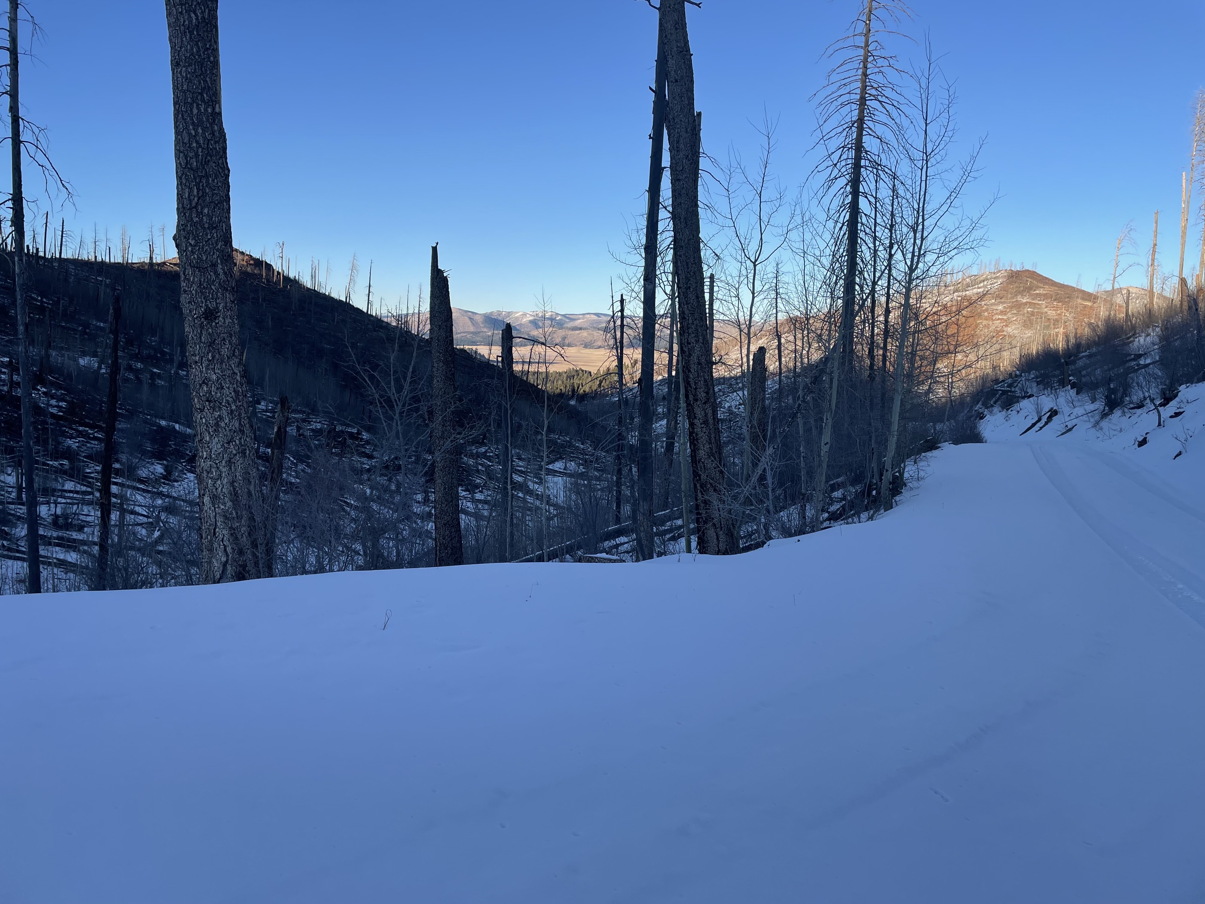 The higher I got in Corral Canyon, the deeper the snow. At the junction with the FR, it’s 5. If I ski before it snows, I’ll drive to the junction and smi the loop, etc. The road starts having protruding rocks about halfway down. I walked maybe 1/3 mike from below the road to the pullout.