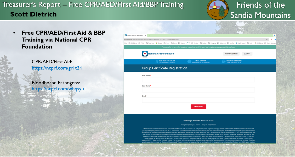 Thanks, Tim! Your email made me realize that I inadvertently deleted the slide that Scott put together regarding the free CPR/AED/First Aid & BBP Training via National CPR Foundation. My apologies. Here are the links for those interested...